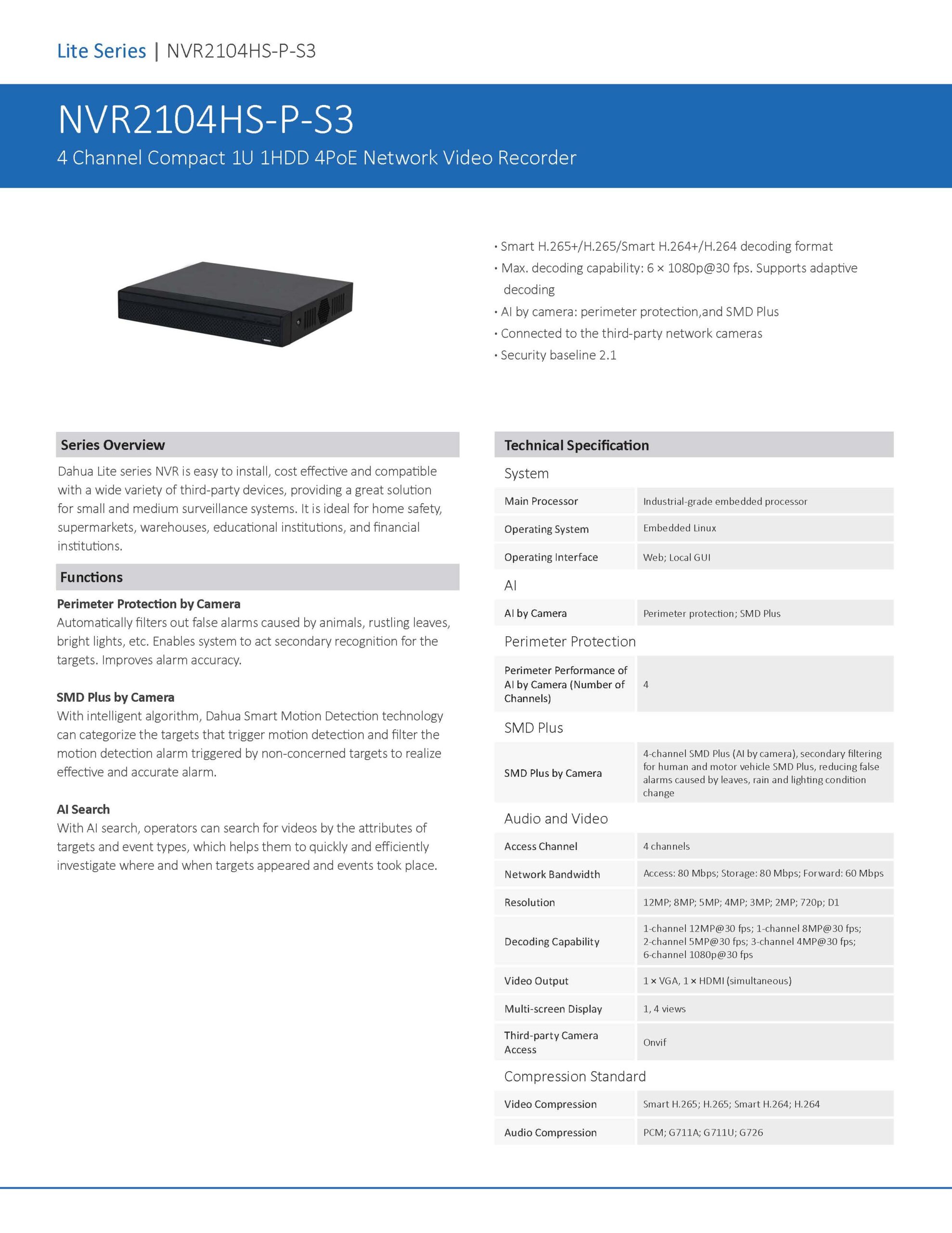 The Dahua NVR2104HS-P-S3 is a network video recorder designed for surveillance systems.