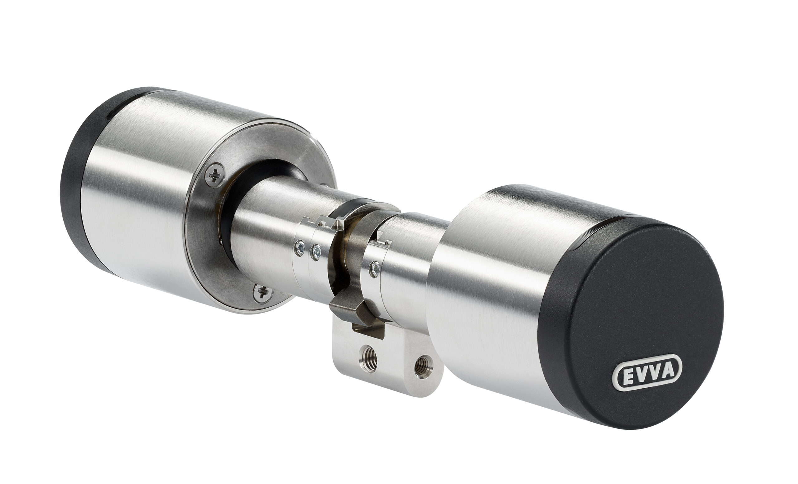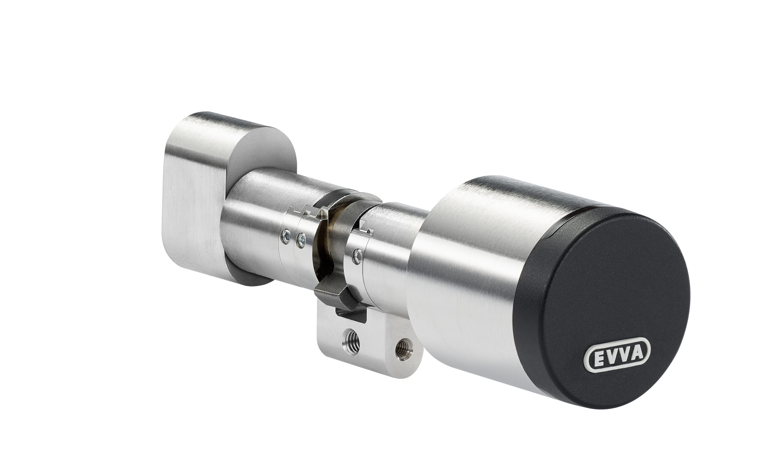 – It features an electronic reader unit on one side and a mechanical locking mechanism on the opposite side, compatible with modular EVVA locking systems.